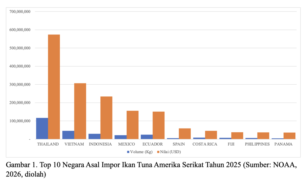 Pada 2025, pasar tuna Amerika Serikat menunjukkan ketergantungan yang sangat besar terhadap kawasan ASEAN, termasuk Indonesia. Data impor mencatat total 312,59 juta kilogram tuna dengan nilai mencapai USD 1,93 miliar, di mana sekitar 63,5 persen volumenya berasal dari negara-negara Asia Tenggara.